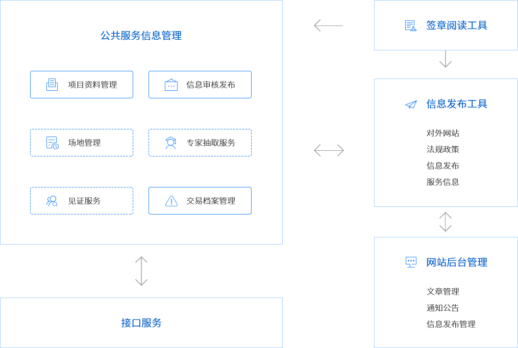 基础产品交易服务平台,是满足公共资源交易技术规范的要求,为公共资源交易中心打造集信息化、电子化、智慧化服务能力于一身的服务平台。平台提供公共资源交易门户网站,建立标准接口与电子交易平台、各级服务或监督平台进行对接,可实现招标采购公告、答疑补遗、中标公告等交易信息的多网发布。平台提供企业信息、场地资源、专家资源的共享和专家抽取、场地预约、工作流业务办理等专业交易服务。